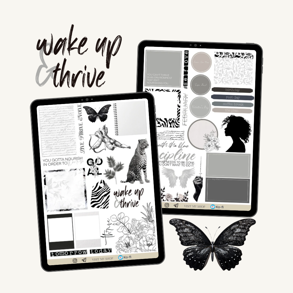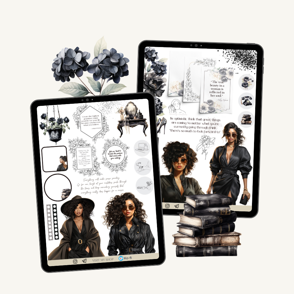 2 pages 34 pre-cropped monochrome stickers with independent girls, quotes, icons and black decorative elements.