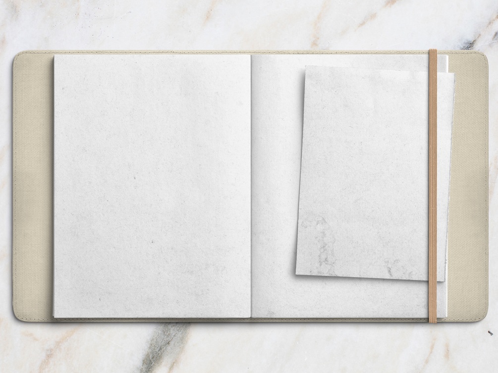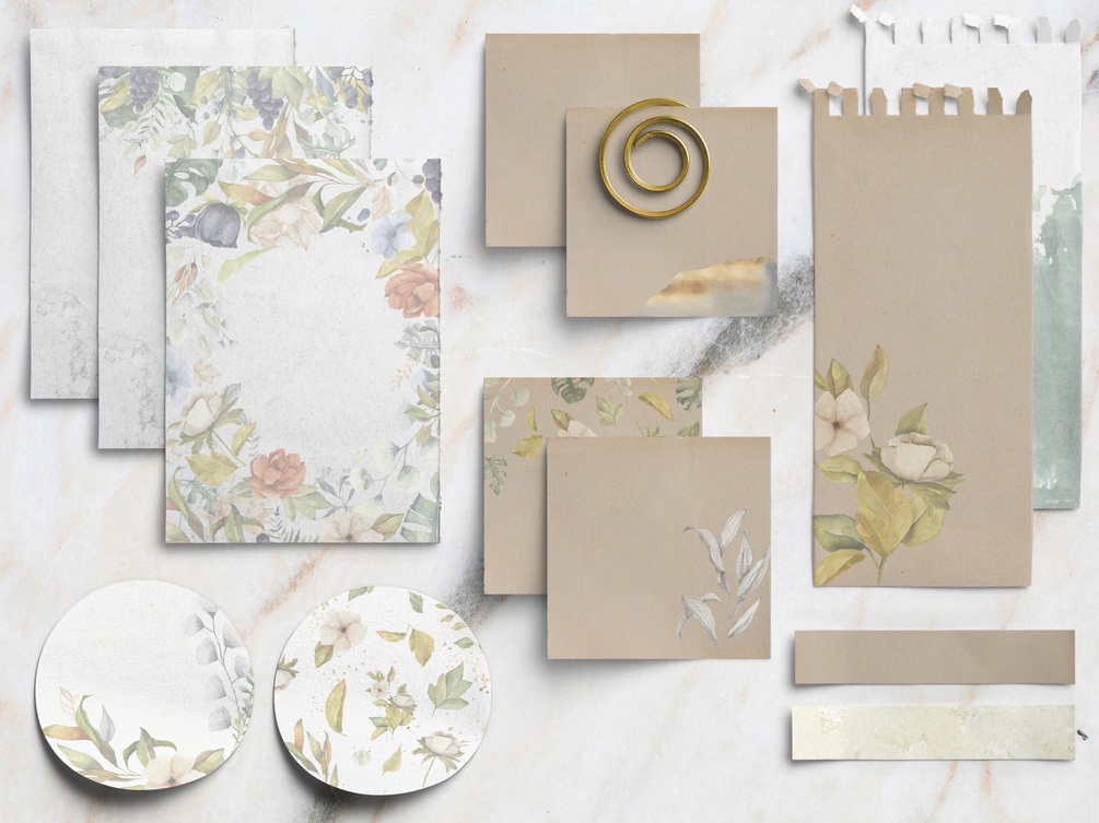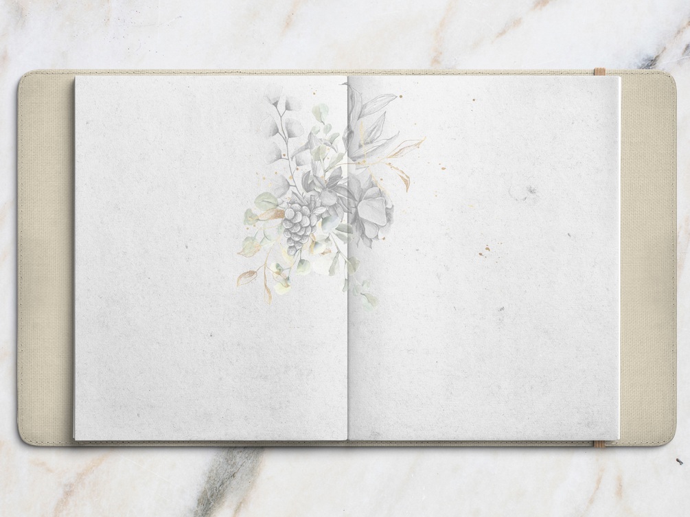 Realistic notebook 12 pages includes: cover, 10 different pages template and marble background for collage or stickers (like on preview). Also realistic papery stickers for notes, beautiful watercolor decorative stickers, grids and words for planning.